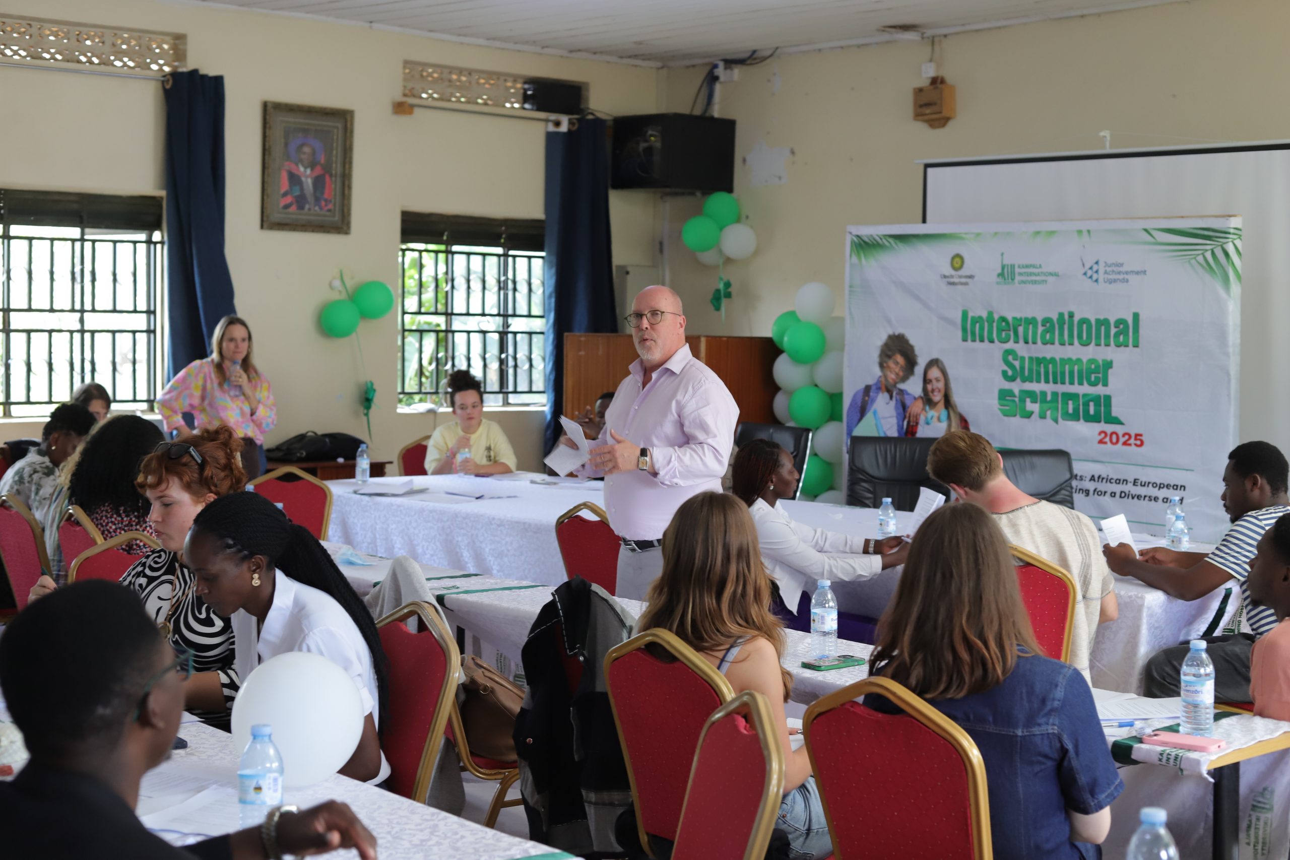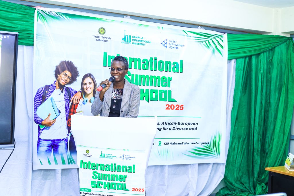 From Left to Right (Seated): Prof. Sarah Anschütz – Utrecht University, Netherlands, Mr. Ambrose Kibuuka Mukiibi – Board Member, Kampala International University (KIU), Ms. Christine Ainebyona – University Secretary, Kampala International University (KIU), Dr. Ester Driel – Utrecht University, Netherlands, Engr. Christine Mugimba – Director, ICT and Research, Prof. Gerrit Dielissen – Utrecht University, Netherlands, Prof. Muhammad Ngoma – Vice Chancellor, Kampala International University (KIU), Prof. Regina Ejemot-Nwadiaro – DVC–RICE and KIU Coordinator, International Summer School, Ms. Mary Nanyomo – Programs Director, Junior Achievement Uganda (JAU)